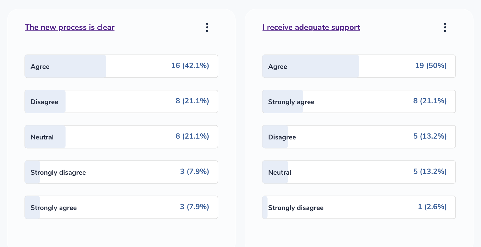 Example above: 'The new process is clear' has 50% agreement compared to 'I receive adequate support' which has 71% agreement.